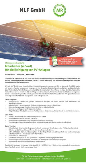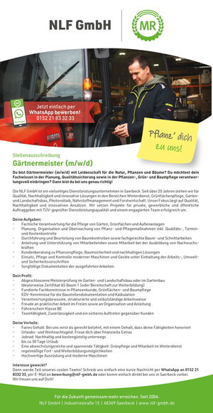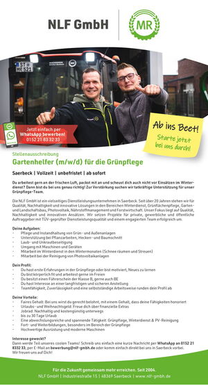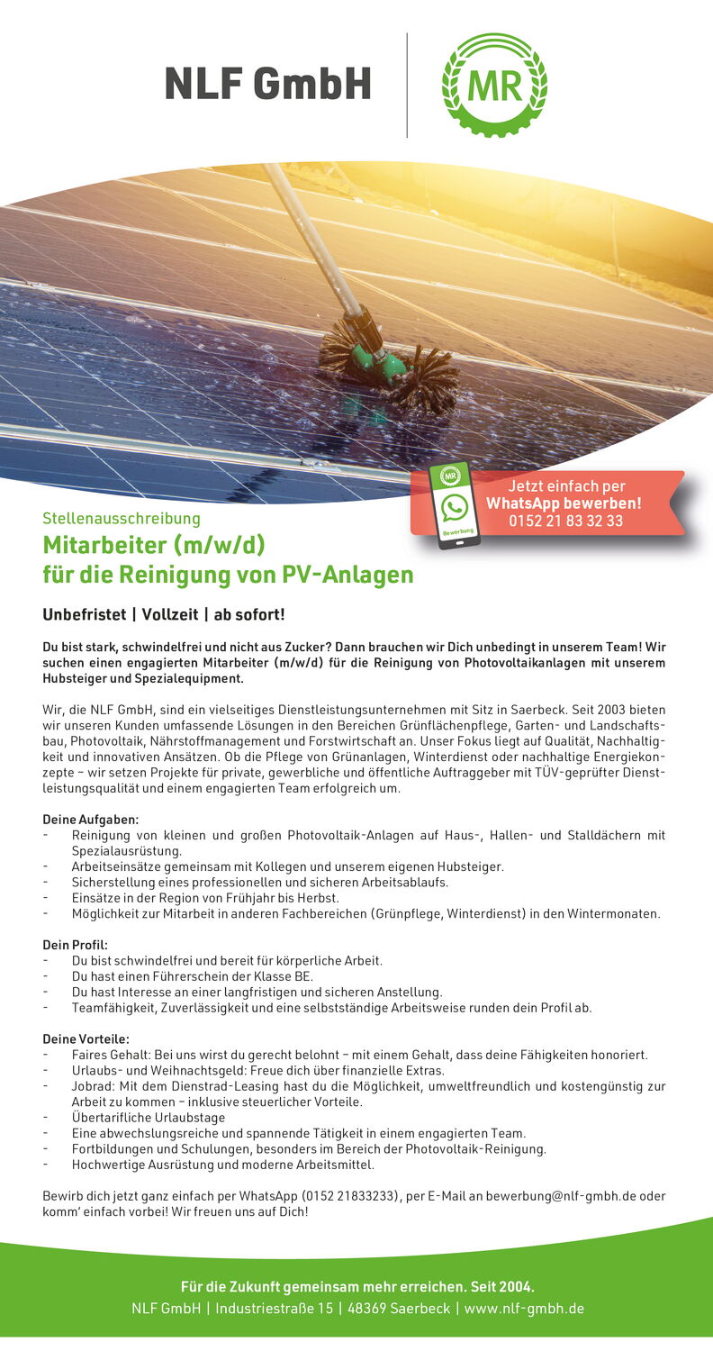 Bewirb dich jetzt ganz einfach per WhatsApp (0152 21833233), per E-Mail an bewerbung@nlf-gmbh.de oder