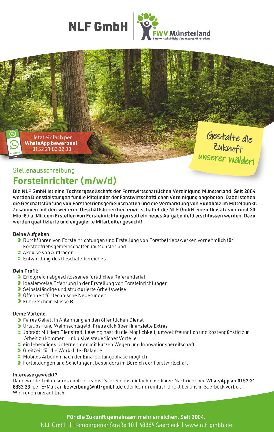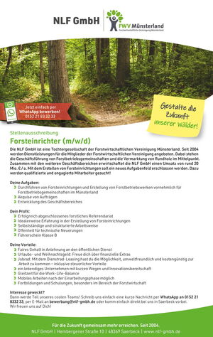 Die NLF GmbH ist eine Tochtergesellschaft der Forstwirtschaftlichen Vereinigung Münsterland. Seit 2004 werden Dienstleistungen für die Mitglieder der Forstwirtschaftlichen Vereinigung angeboten. Dabei stehen die Geschäftsführung von Forstbetriebsgemeinschaften und die Vermarktung von Rundholz im Mittelpunkt. Zusammen mit den weiteren Geschäftsbereichen erwirtschaftet die NLF GmbH einen Umsatz von rund 20 Mio. € / a. Mit dem Erstellen von Forsteinrichtungen soll ein neues Aufgabenfeld erschlossen werden. Dazu werden qualifizierte und engagierte Mitarbeiter gesucht!