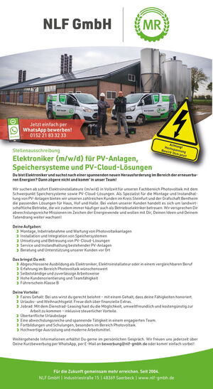 Wir suchen ab sofort Elektroinstallateure (m/w/d) in Vollzeit für unseren Fachbereich Photovoltaik mit dem Schwerpunkt Speichersysteme sowie PV-Cloud-Lösungen. Als Spezialist für die Montage und Instandhaltung von PV-Anlagen bieten wir unseren zahlreichen Kunden im Kreis Steinfurt und der Grafschaft Bentheim die passenden Lösungen für Haus, Hof und Halle. Bei vielen unserer Kunden handelt es sich um landwirtschaftliche Betriebe, die wir zudem immer häufiger auch als Betriebselektriker betreuen. Wir versprechen Dir abwechslungsreiche Missionen im Zeichen der Energiewende und wollen mit Dir, Deinen Ideen und Deinem Tatendrang weiter wachsen!