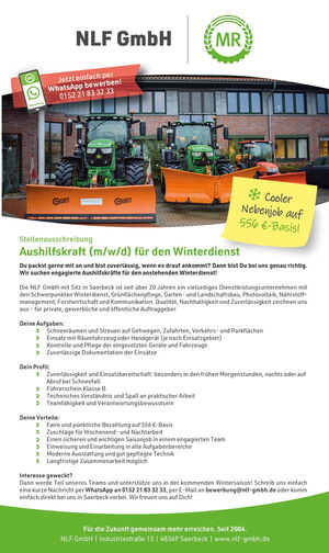 Dann werde Teil unseres Teams und unterstütze uns in der kommenden Wintersaison! Schreib uns einfach eine kurze Nachricht per WhatsApp an 0152 21 83 32 33, per E-Mail an bewerbung@nlf-gmbh.de oder komm einfach direkt bei uns in Saerbeck vorbei. Wir freuen uns auf Dich!