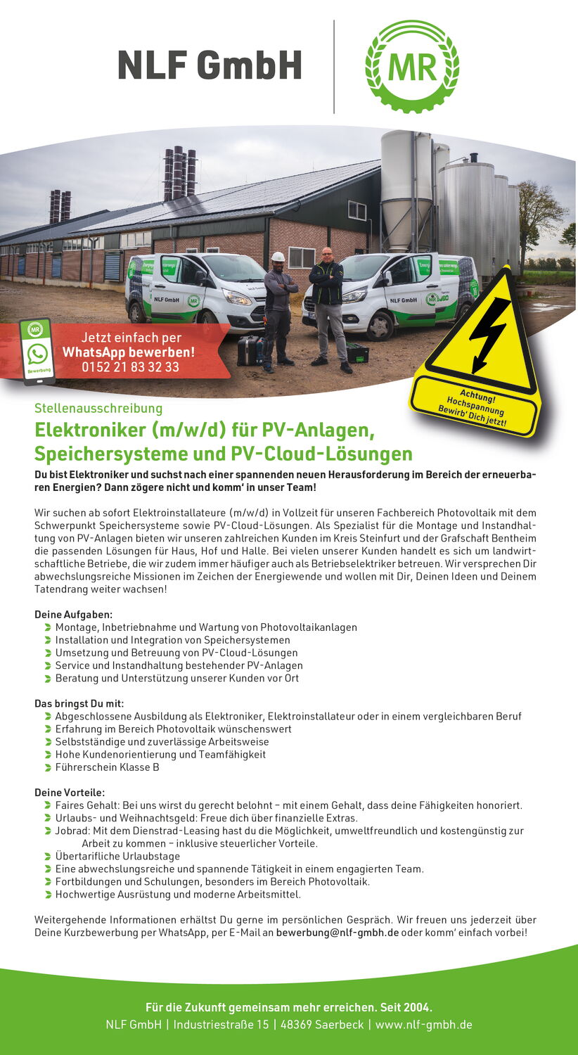 Dann werde Teil unseres coolen Teams! Schreib uns einfach eine kurze Nachricht per WhatsApp an 0152 21 8332 33, per E-Mail an bewerbung@nlf-gmbh.de oder komm einfach direkt bei uns in Saerbeck vorbei. Wir freuen uns auf Dich!